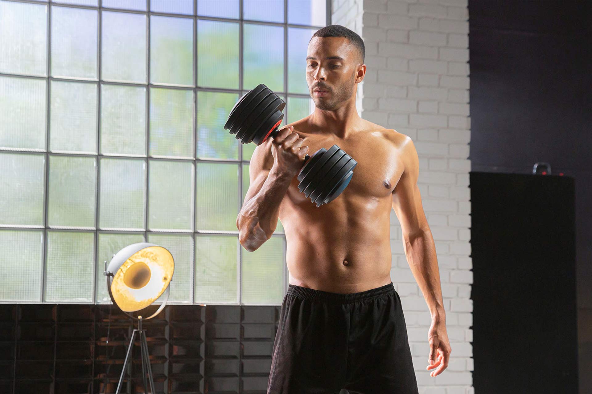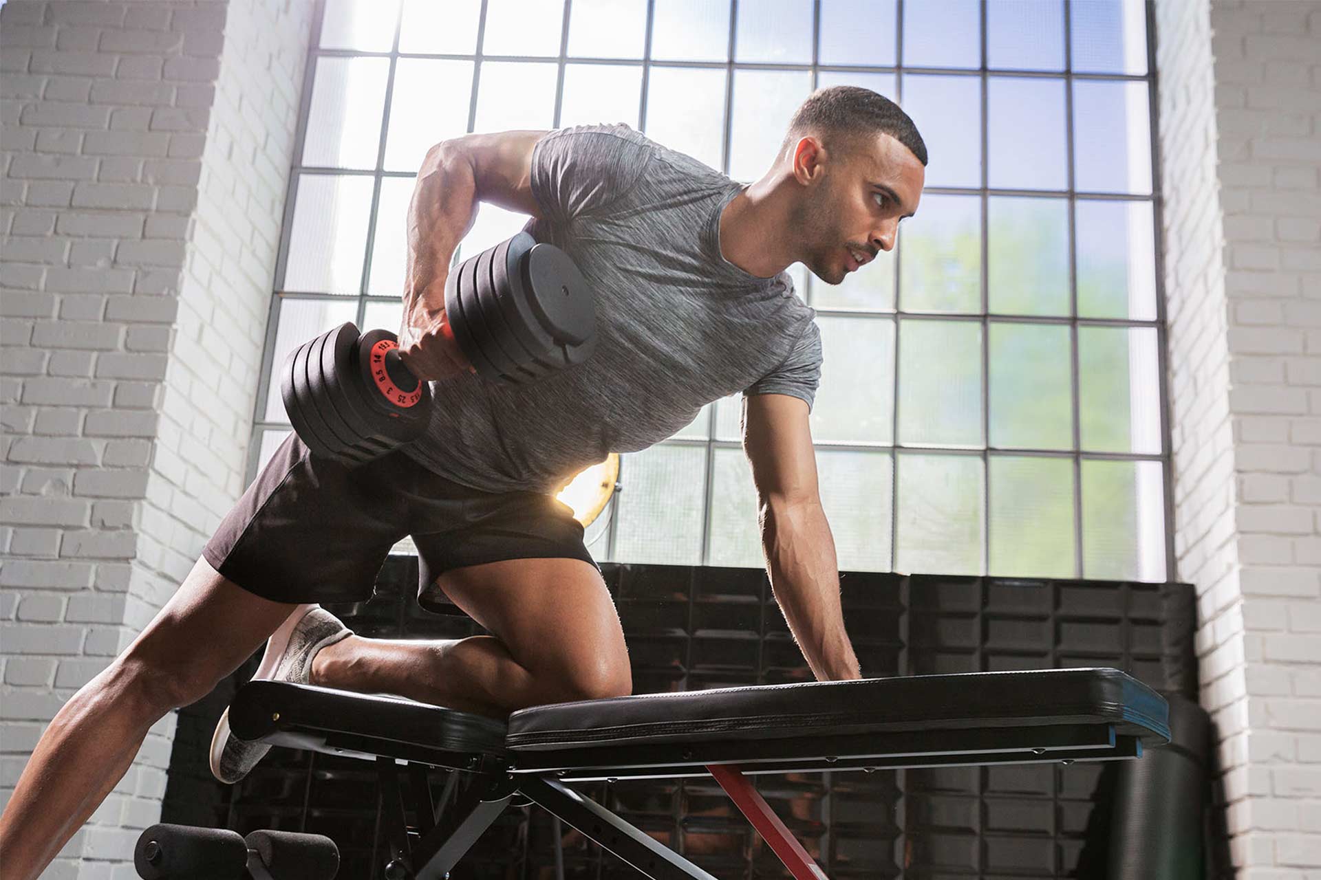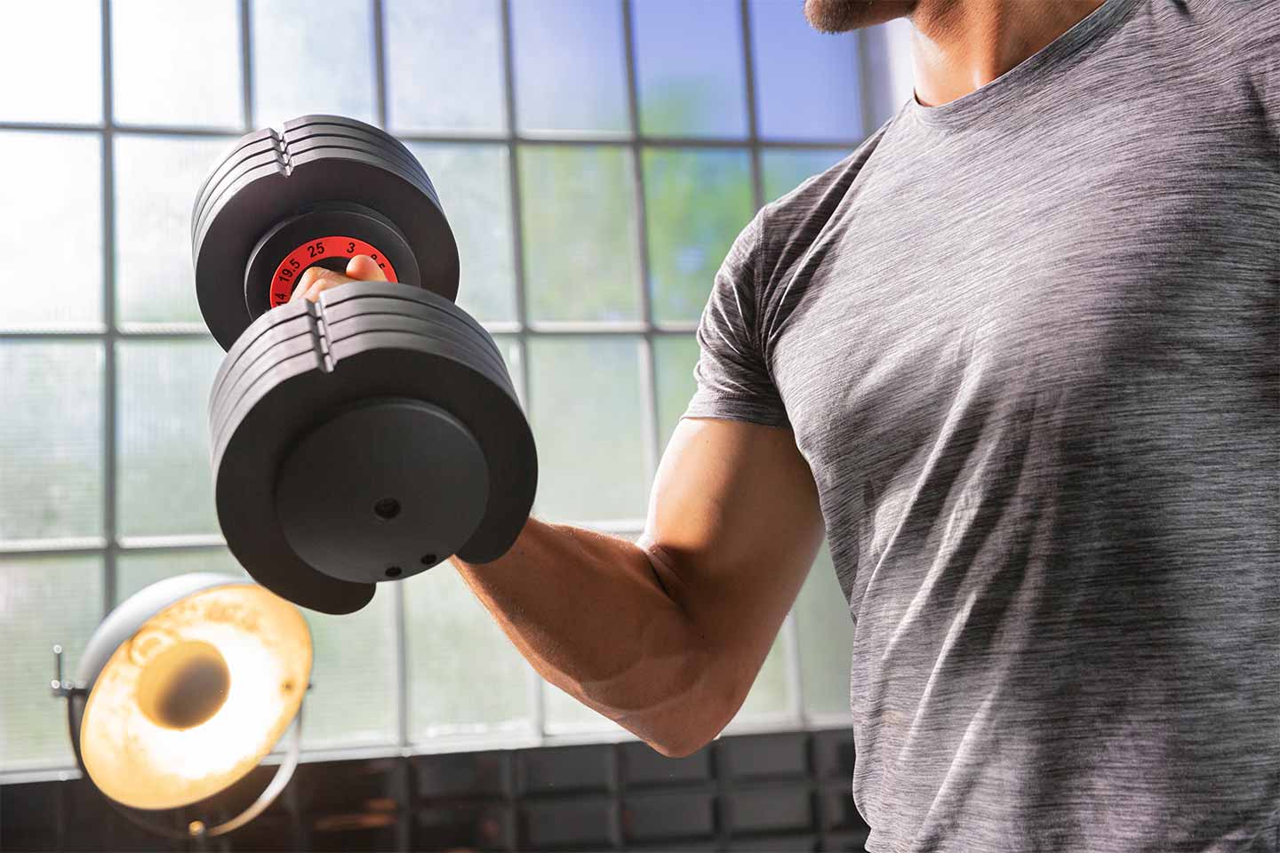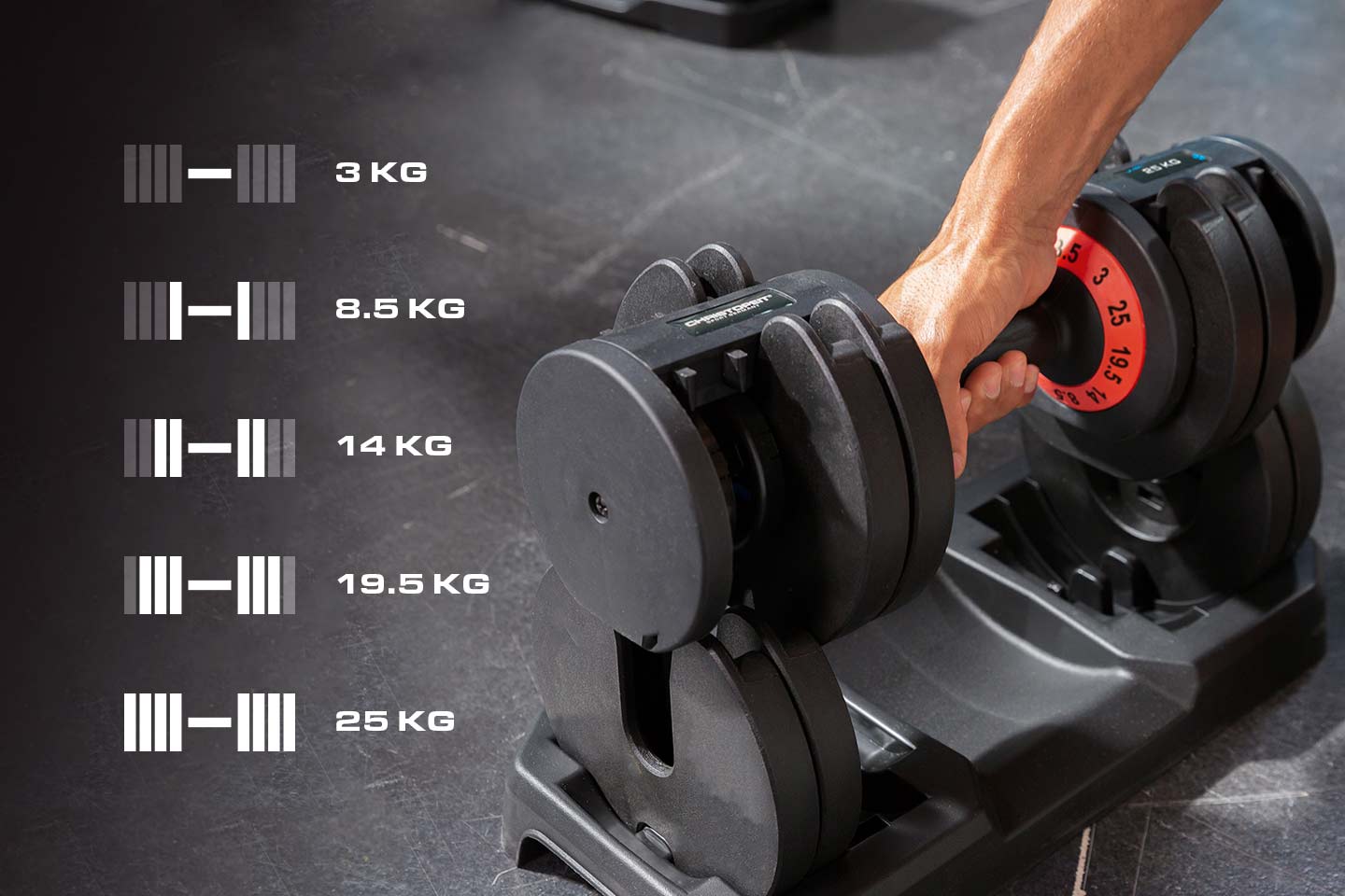Die Kompakthantel bietet Dir 5 Gewichtsklassen in nur einer Hantel.